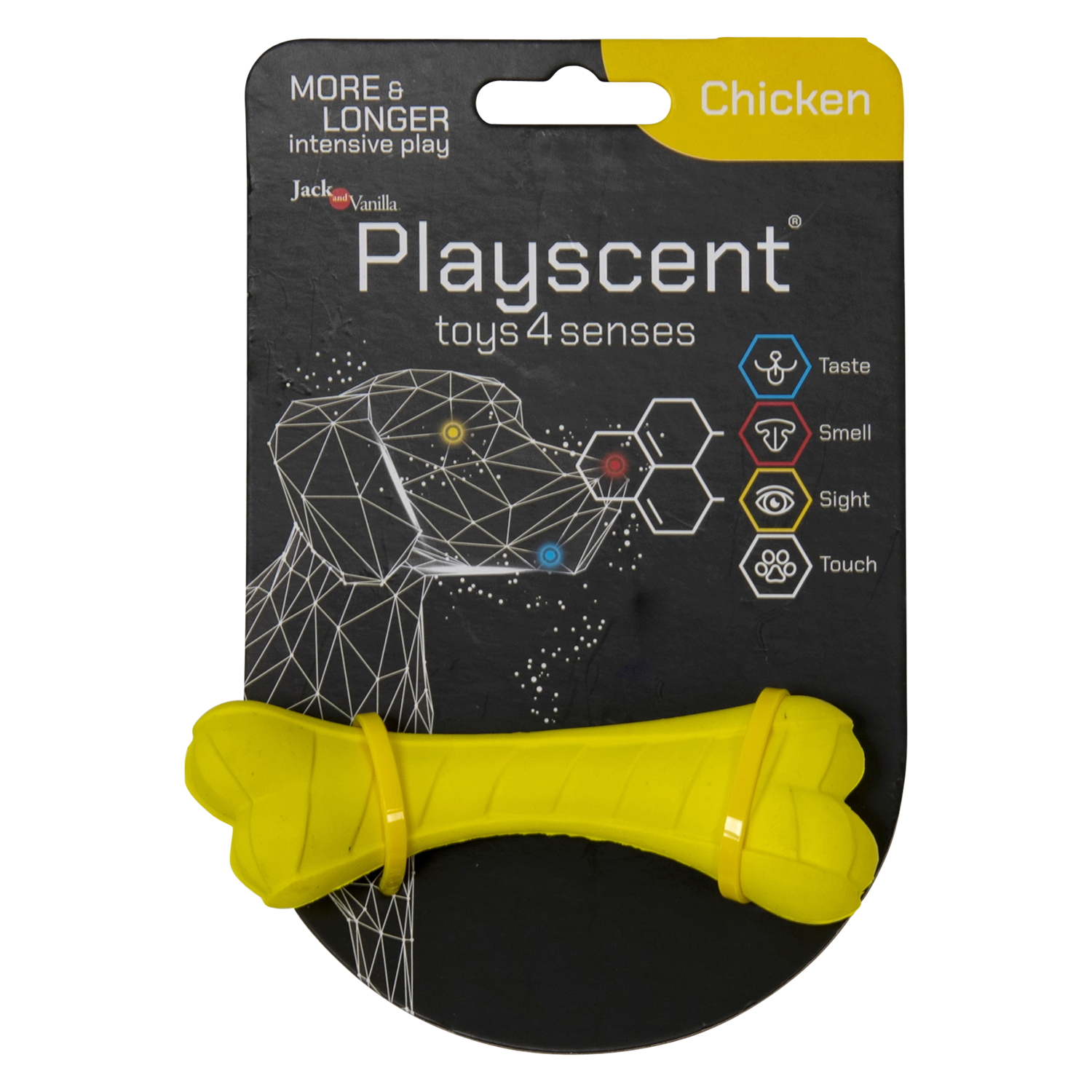 Verrijkt met Kip Smaak: Het Playscent Been is doordrenkt met een kip aroma, wat het extra aantrekkelijk maakt voor uw hond en hun zintuigen prikkelt tijdens het spelen.